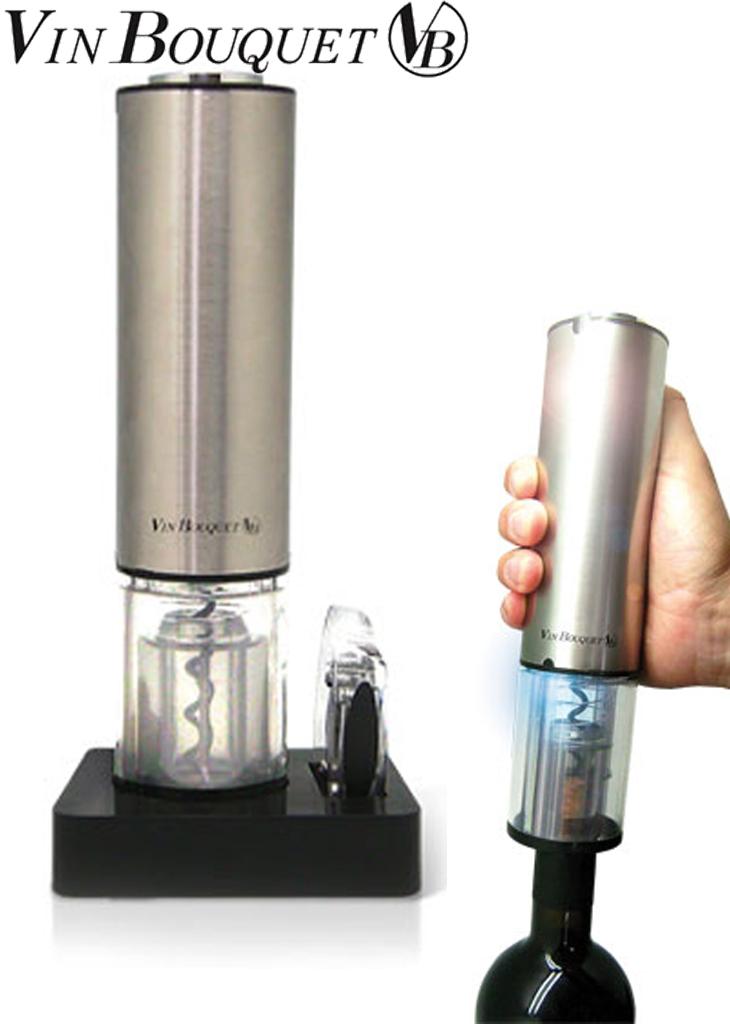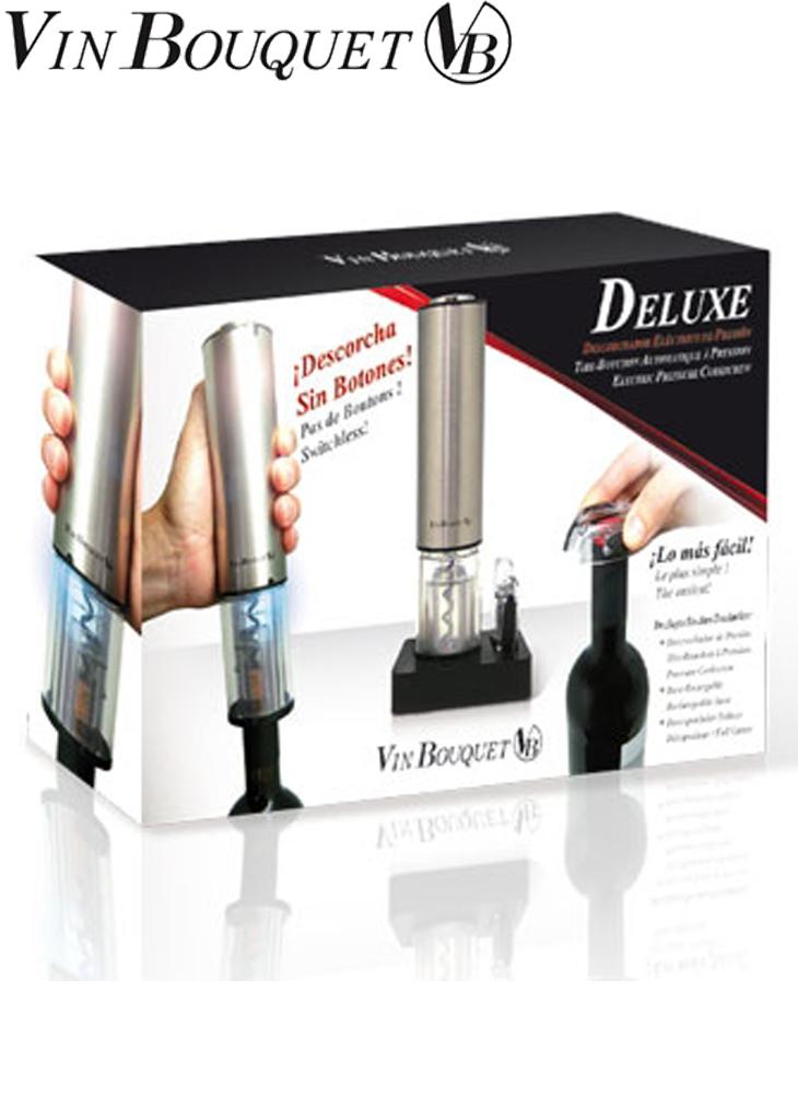 Printr-o simpla apasare de buton, tirbusonul electric Deluxe va extrage in mod automat dopul din sticla de vin. Acesta deschide 30 de butelii cu o singura incarcare.