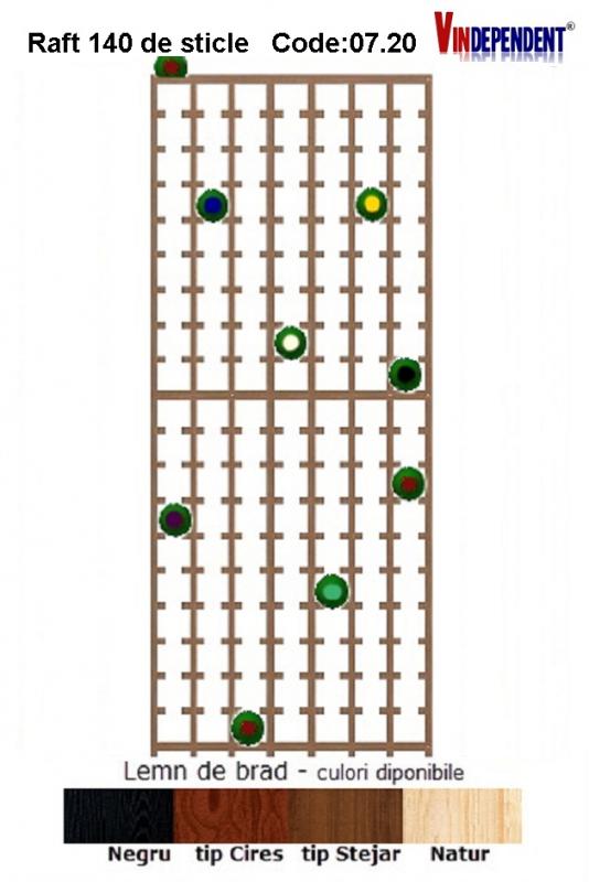 Raftul inalt din lemn de brad depoziteaza 140 sticle vin. Datorita numarului mare de sticle vin pe care le poate sustine, acest raft se poate aseza in crame, vinoteci, magazine de vinuri. Poate fi produs in una dintre culorile: natur, negru, tip cires, tip stejar. Pretul afisat este aferent raftului natur. La rafturile baituite, pretul este mai mare cu 10%.